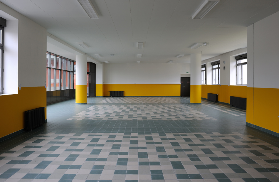 Le soin apporté aux aménagements intérieurs, au mobilier fixe, les couleurs employées, les motifs de linoleum, les modèles de patères, ainsi que les carrelages et leurs calepinages sont autant de clins d’œil délicats à l’époque de construction du bâtiment et à ses codes, contrastant avec le traitement brutal des plafonds marquant le sinistre subi par les planchers.